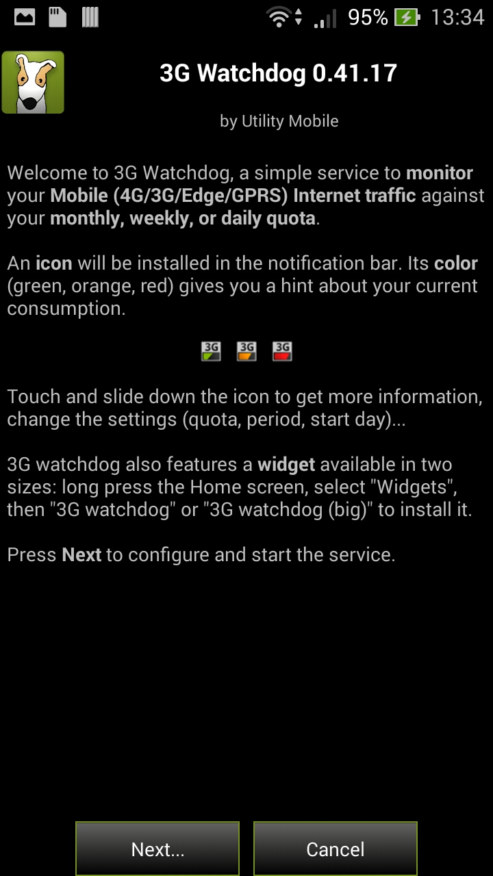 Non ti viene detto nulla di particolare ad eccezione che il programma aggiungerà un’icona visibile sulla parte alta dello schermo (barra delle notifiche) che avrà 3 diversi colori (verde, arancione e rosso) che ti avvertono dell’utilizzo complessivo del tuo traffico dati (verde significa poco utilizzato mentre rosso quasi al limite). Clicca su Next.