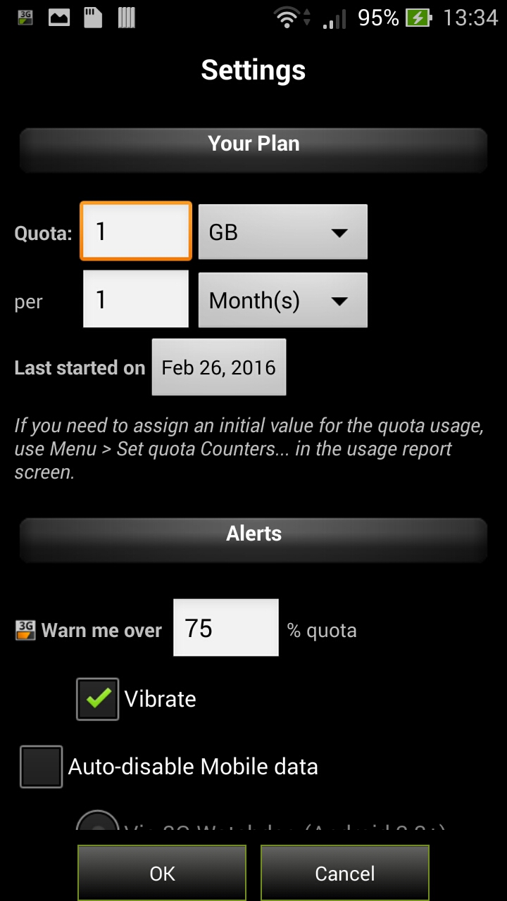 Ok ti comparirà questa schermata dove potrai settare il tuo traffico dati. Nella Tab Your Plan dovrai indicare quanti megabyte o gigabyte hai nell’arco di che periodo. In poche parole: se hai un piano che ti da 3 gigabyte in un mese dovrai scrivere “3” in Quota e “1” in per e indicare GB e Month per i rispettivi campi. Se invece hai per esempio 500 megabyte in una settimana, dovrai scrivere “500” in Quota e “1” in per e indicare MB e Week per i rispettivi campi. Successivamente dovrai indicare la data di quando è iniziata l’ultima volta la promozione.