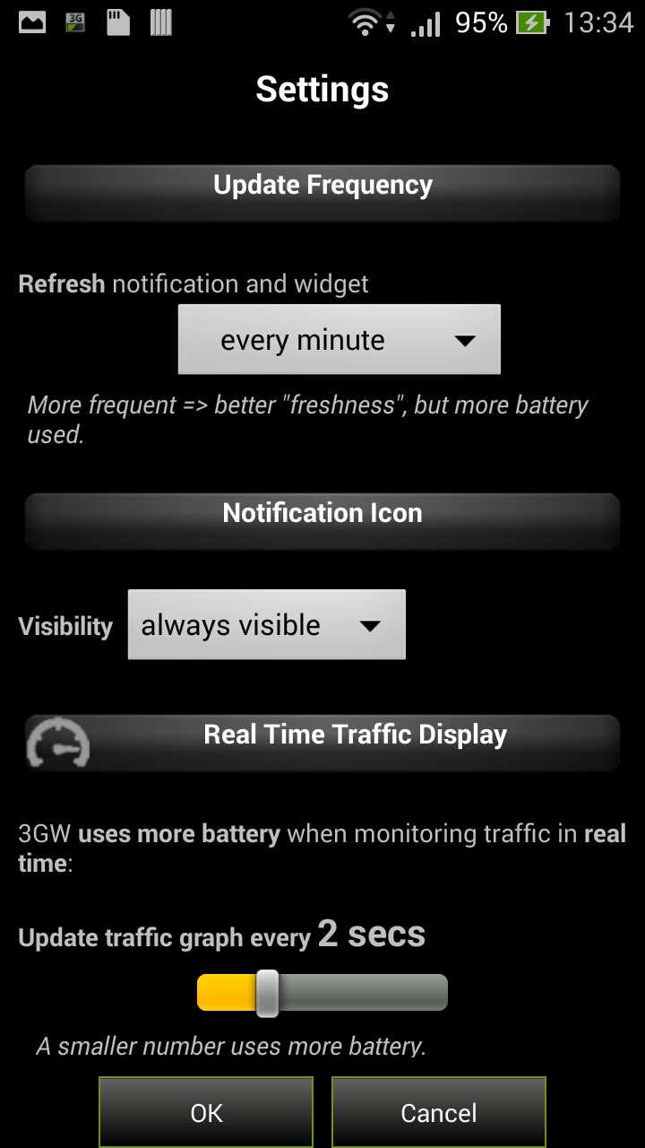 Nella Tab Real time Traffic Display ti verrà data la possibilità di indicare ogni quanti secondi il programma aggiornerà i valori del traffico usato (quindi quelli che vedi dal programma aprendolo e non dall’icona o dal widget). Diminuire i tempi aumenta la precisione, ma anche il consumo di batteria. 2 secondi come da default sono più che sufficienti nel 99% dei casi.