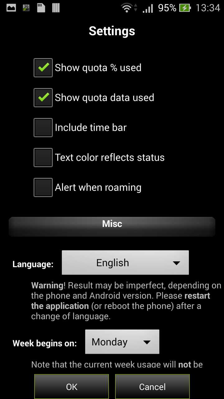 Nella Tab Alerts invece ti sarà possibile indicare al programma di avvertirti quando hai raggiunto una certa percentuale di utilizzo (75% nell’immagine) si può anche indicare di staccare il 3g se si spunta la voce “Auto Disable Mobile Data”.