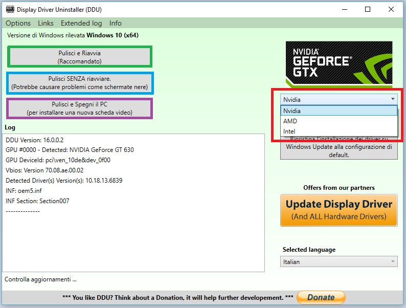Selezionando Pulisci e Spegni il PC: Verranno disinstallati i driver e verrà spento il PC, in modo che puoi tranquillamente smontarlo e cambiare scheda video. All’avvio installa i driver correlati al tuo modello.
