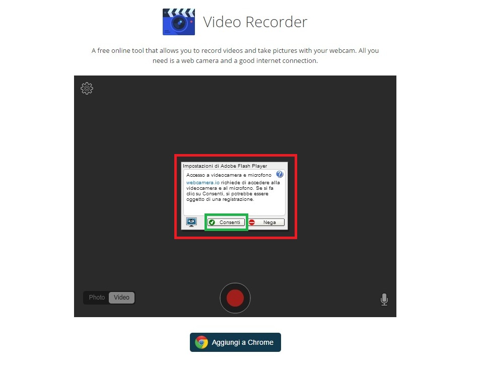 Una volta aperto il sito chiederà il consenso di usare la webcam e il microfono: