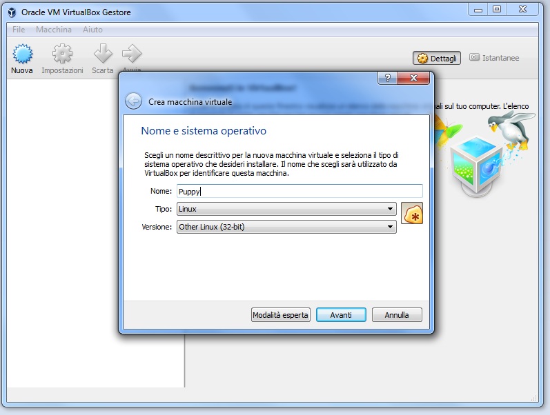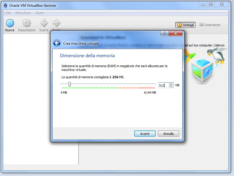 Inseriamo Nome e il tipo di sistema (ricordo che nell’esempio stiamo usando una versione di Linux). Facciamo Click su Avanti e proseguiamo con l’assegnazione della RAM: