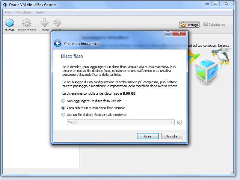 Qui dovete impostare la RAM secondo il vostro sistema che volete emulare, per linux bastano 512mb. Cliaccando su Avanti adesso avremo la schermata per creare un disco: